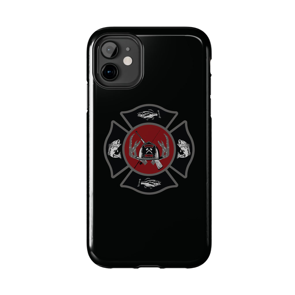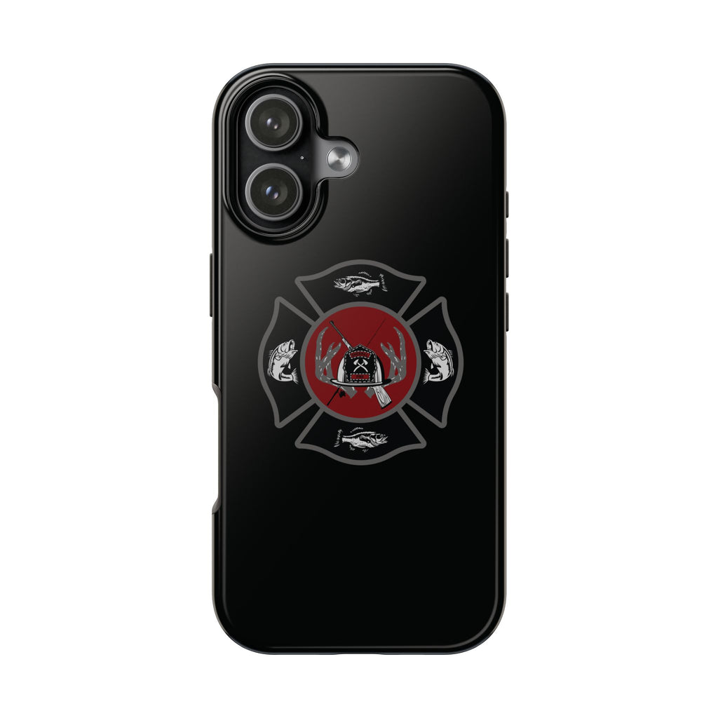 This tough phone case brings rugged protection and a bold, lodge-ready look to your daily gear. The design centers on a firefighter-style Maltese cross with layered outdoor motifs — fish, antlers and a campfire — set against a deep red disk for contrast. Snap the two-piece polycarbonate shell over the TPU liner and your phone gains multi-stage impact defense while keeping a slim profile. The glossy finish makes the artwork pop and the UV protection keeps colors vivid even after long exposure to sun and water. It’s built for people who spend time on the water, at the cabin, or answering calls after a long day outdoors — reliable, weather-ready, and visually grounded in rugged, conservation-minded symbols.